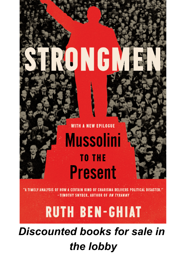 Strongmen (2021) describes what modern authoritarian leaders have in common and how they can be stopped. It lays bare the blueprint they have followed over the past 100 years, which empowers us to recognize, resist, and prevent their disastrous rule in the future. Ben-Ghiat’s seven books also include the recent bestseller, Strongmen: How They Rise, Why They Succeed, How They Fall (2021), explaining how countries from Russia to India, Turkey to America, draw on a playbook established by figures such as Mussolini, Gaddafi, and Hitler.